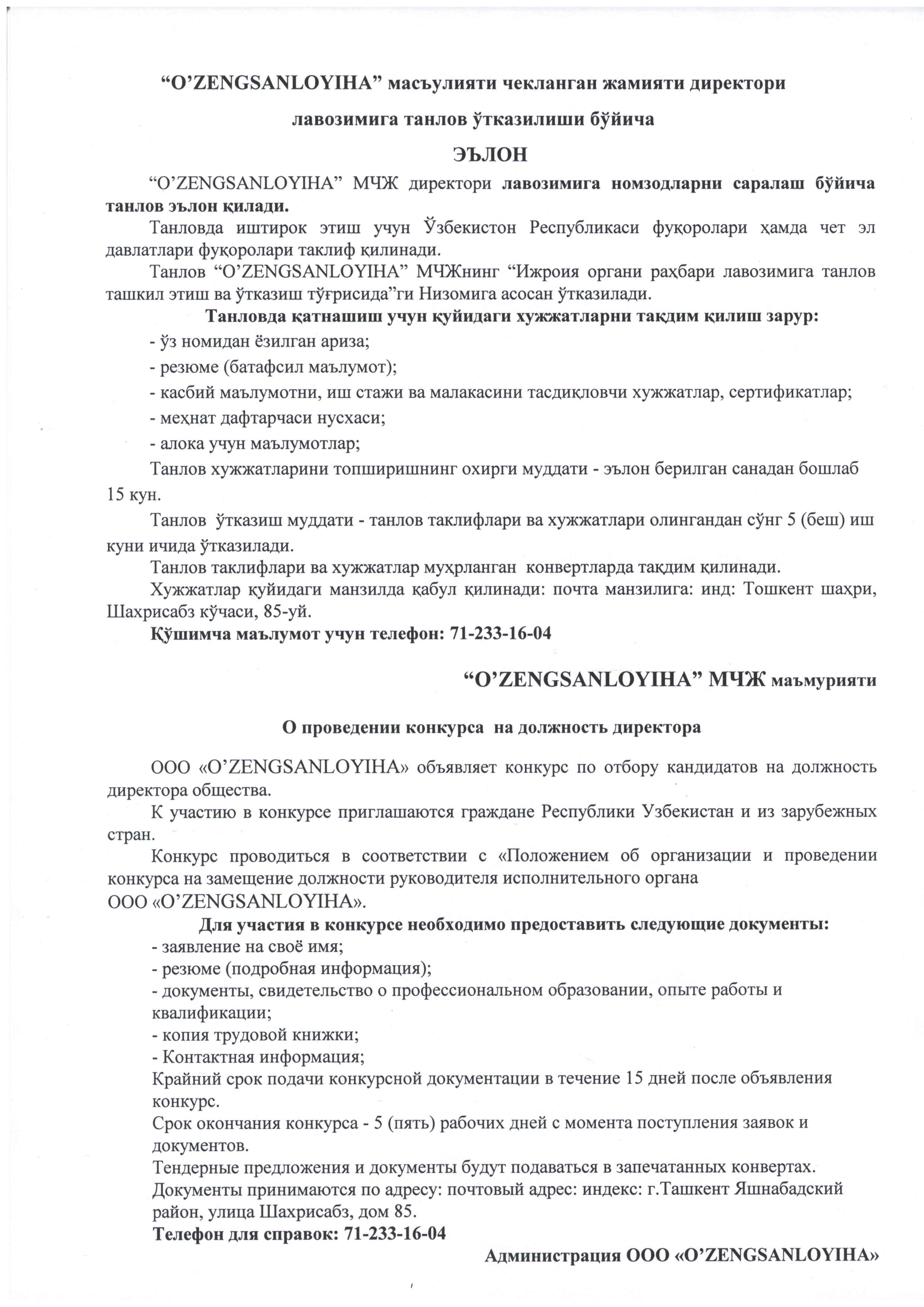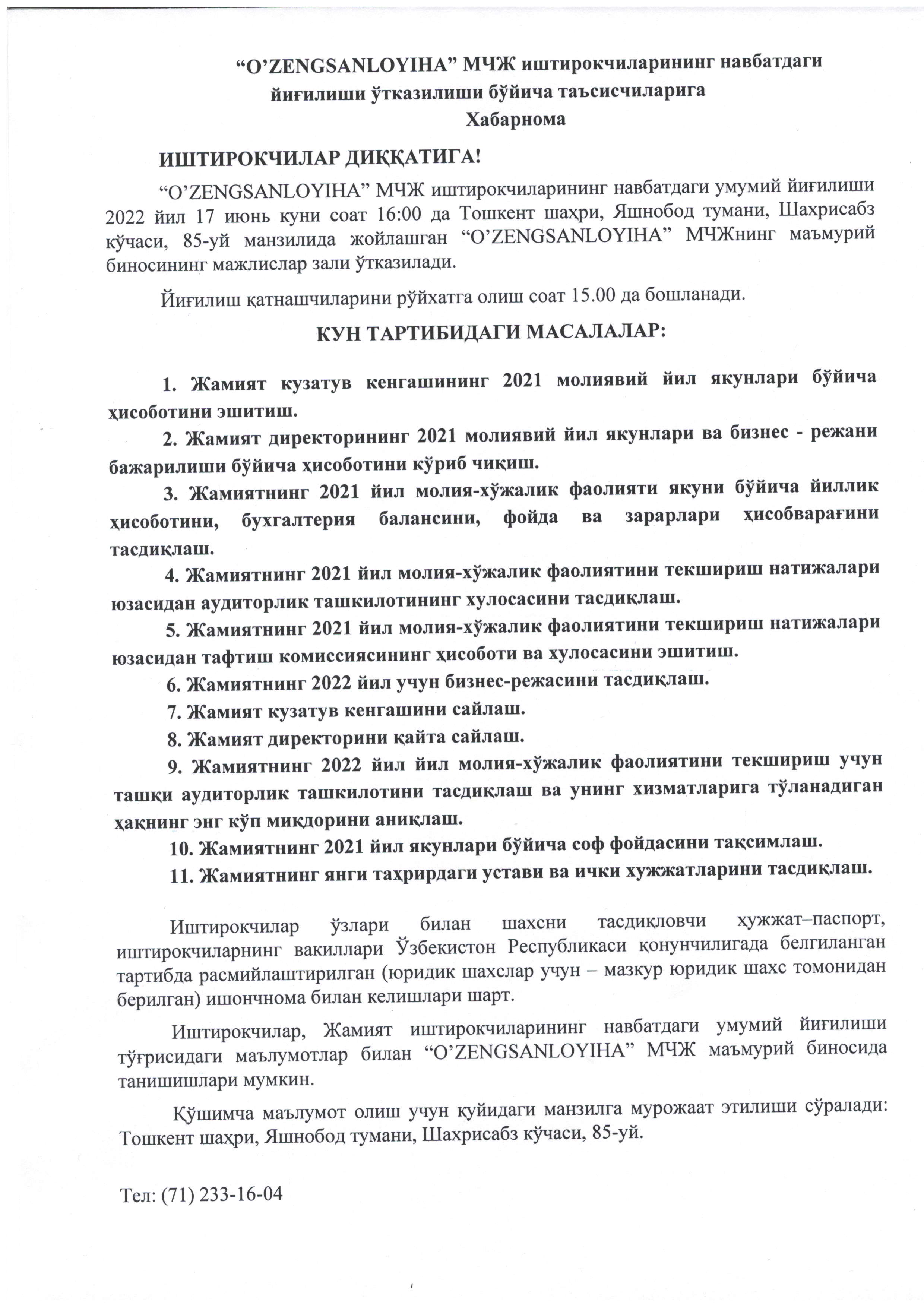 OZENGSANLOYIHA мчЖ иштирокчиларининг навбатдаги йигилиши тказилиши буйича таъсисчиларига Хабарнома